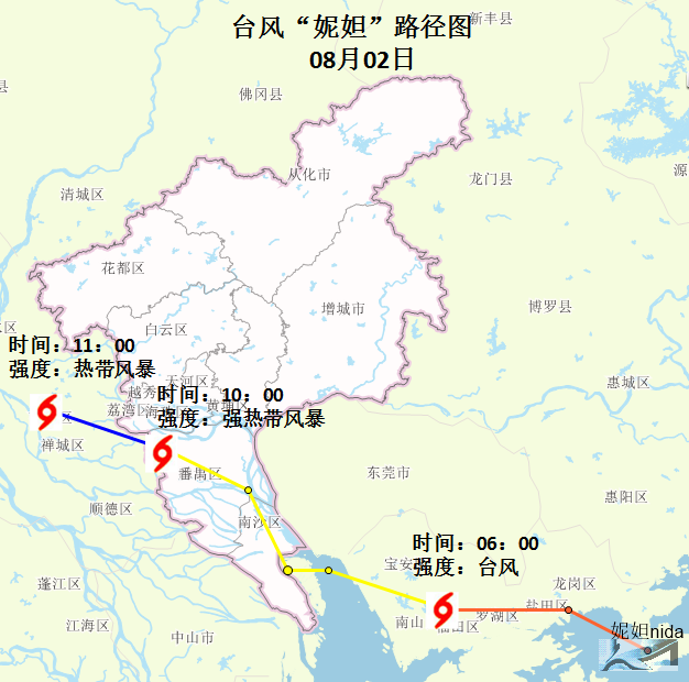 根據廣州市氣象監(jiān)測網最新數據顯示,“妮妲”中心于今晨7時40分進入我市南沙區(qū),中心氣壓980hPa,中心風力30m/s(11級),強度為強熱帶風暴,接著“妮妲”以25公里左右的時速繼續(xù)向西偏北方向移動,于9時進入番禺區(qū),10時在番禺區(qū)鐘村附近,強度繼續(xù)減弱,中心風力25m/s(10級),最后穿過荔灣西部后于10時10分離開廣州,11時其中心處于佛山境內,強度減弱為熱帶風暴,中心風力降至23m/s(9級),經統(tǒng)計“妮妲”中心在廣州滯留共2時30分。