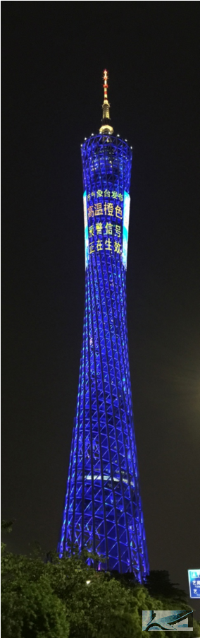 2013年8月和2015年7月投入運行了廣州塔燈光氣象預警信號發布系統和廣州塔LED顯示屏氣象預警信號發布系統。每當氣象臺發布氣象預警信號后,將第一時間通知廣州塔值班人員,按照雙方協議好的發布規定,調用預先制作的氣象災害預警信號圖標和短片,即時就可利用廣州塔燈光系統和LED掛網顯示屏,在塔身上部清晰地發布氣象災害預警信號。為廣州塔周邊民眾第一時間獲知臺風、暴雨、雷雨大風等氣象災害預警信號,及早采取防御措施發揮了重要作用。
