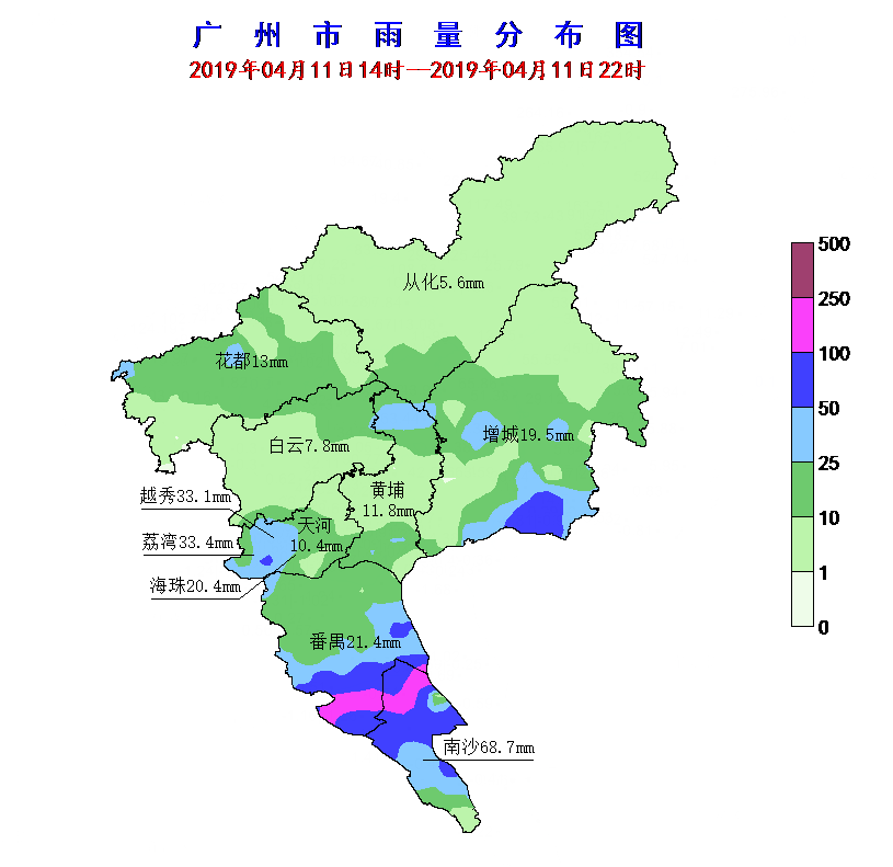 4月11日下午至夜間,廣州大部分地區(qū)出現(xiàn)了強(qiáng)雷雨,并伴有局地冰雹、強(qiáng)雷電、短時(shí)大風(fēng)、短時(shí)強(qiáng)降水等強(qiáng)對(duì)流天氣。根據(jù)氣象水文站網(wǎng)的監(jiān)測(cè),4月11日14時(shí)至22時(shí),增城區(qū)出現(xiàn)了冰雹天氣,全市共有37個(gè)測(cè)站雨量超過(guò)50毫米,其中8個(gè)測(cè)站超過(guò)100毫米,最大降水量出現(xiàn)在南沙區(qū)三防,為118毫米;荔灣區(qū)東沙街錄得市區(qū)最大降水79.8毫米。全市平均面雨量19.6毫米,面雨量前三的區(qū)分別為南沙(68.7毫米)、荔灣(33.4毫米)、越秀(33.1毫米)。另外,全市共有40個(gè)測(cè)站錄得7級(jí)及以上陣風(fēng),其中增城國(guó)家氣象站錄得最大陣風(fēng)34.0米/秒(12級(jí)),海珠區(qū)南洲街錄得市區(qū)最大陣風(fēng)13.7米/秒(6級(jí))。實(shí)況與11日的天氣預(yù)報(bào)結(jié)論“11日午后廣州降水趨于明顯,并可能伴有雷電、短時(shí)大風(fēng)、局地冰雹等強(qiáng)對(duì)流天氣”基本一致。