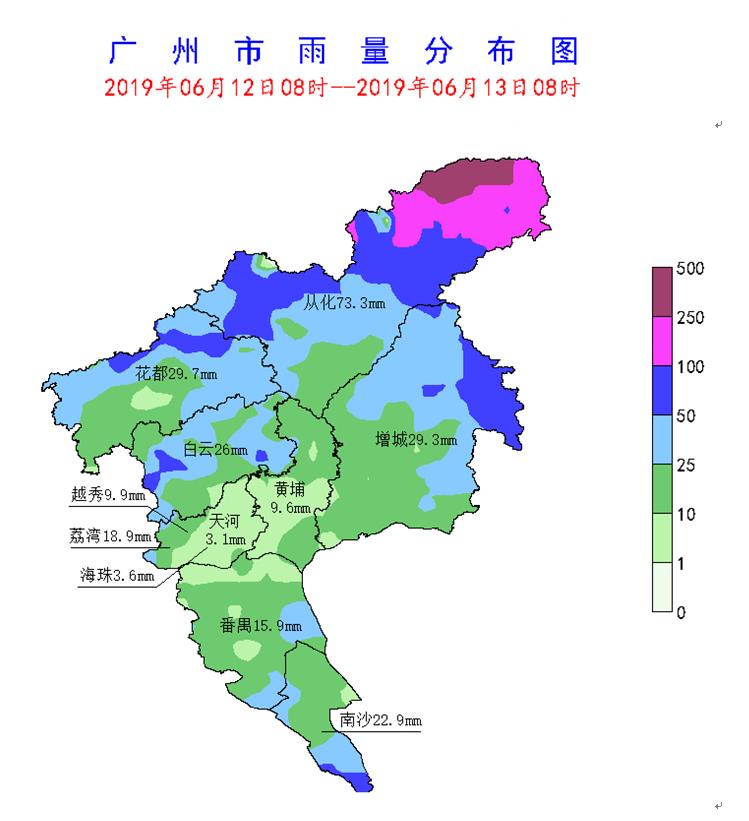 廣州市從化區(qū)發(fā)布了暴雨紅色預(yù)警信號(hào),越秀區(qū)、天河區(qū)、荔灣區(qū)、花都區(qū)、白云區(qū)發(fā)布了暴雨黃色預(yù)警信號(hào);另外,各區(qū)也先后發(fā)布了雷雨大風(fēng)黃色預(yù)警信號(hào)。隨著強(qiáng)降水云團(tuán)的減弱,除從化區(qū)外,13日10時(shí)30左右各區(qū)陸續(xù)解除了各類預(yù)警信號(hào),從化區(qū)隨后在13日14時(shí)30分左右解除了各類預(yù)警信號(hào)。