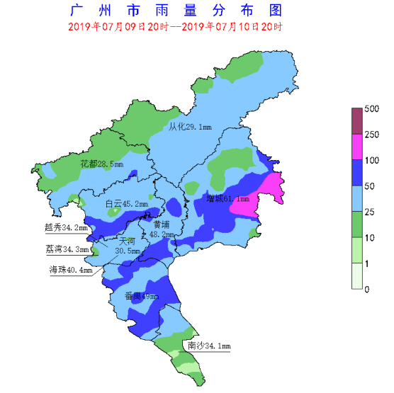 9日夜間至10日我市出現了一次大到暴雨局部大暴雨降水過程,并伴有雷電、7級左右短時大風等強對流天氣,主要降水時段在9日夜間至10日上午。據氣象水文監測,7月9日20時至10日20時,全市平均面雨量為40.9毫米,共有9個測站(2%)錄得100毫米以上降水,88個測站(21%)錄得50~100毫米降水,增城區荔城龍舟比賽場錄得最大累積雨量222.3毫米,最大小時雨量65.3毫米出現在增城增江街東方村。各區最大雨量(單位:毫米): 增城區222.3,番禺區80.4,黃埔區80.1,南沙區75.1,白云區75,海珠區74.3,荔灣區58.6,天河區58.6,花都區52.8,越秀區51.3,從化區43.7。此次強降水過程具有“分布不均勻、局地雨強強、持續時間長”的特點。