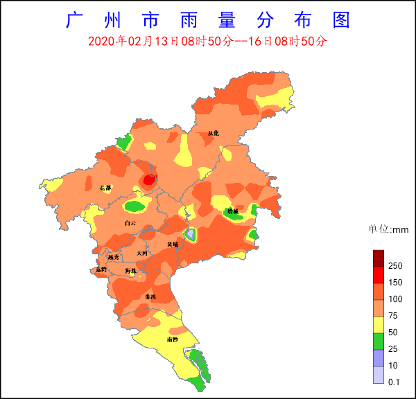 13日早晨至16日上半夜,廣州市出現了全市范圍的大雨到暴雨天氣,并伴有雷電和6~8級陣風。據氣象水文監測網統計,13日08時至16日08時,全市平均面雨量為85.5毫米,共有353個站點(占總數86%)錄得50毫米以上降水,102個站點(占總數25%)雨量在100毫米以上,其中最大累積雨量199.6毫米出現在花都區街北高速收費站,最大小時雨量43.4毫米出現在南沙區東涌鎮;越秀區火車站廣場錄得市區最大累積雨量116.6毫米。各區最大累積雨量(單位:毫米):花都199.6,番禺136.0,白云129.8,黃埔122.0,越秀116.6,增城112.5,荔灣109.4,從化108.5,天河107.6,海珠106.2,南沙97.6。