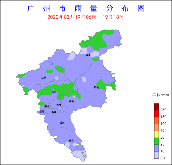 3月19日白天,廣州市自北向南出現了中到大雨。據氣象水文監測網統計,19日06時至18時,全市平均面雨量為18.5毫米,共55個站點(占總數13%)錄得25毫米以上降水,其中荔灣區西灣路錄得全市最大雨量35.2毫米和全市最大小時雨強19.6毫米。各區最大累計雨量(單位:毫米):越秀27,荔灣35.2,天河32,海珠21.8,黃埔31,白云33,番禺18.3,南沙15.2,花都34.1,從化29.1,增城29.2。