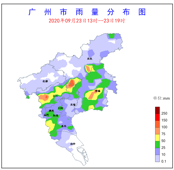 受弱冷空氣和切變線影響,23日13時至19時,我市中北部地區出現大到暴雨局部大暴雨,增城區、黃埔區局部出現了7-9級陣風。全市平均雨量16mm,共有28個測站雨量超過50mm,其中3個測站雨量超過100mm,從化區飛鵝村錄得全市最大雨量119.7mm,從化區新田村錄得最大小時雨量83.7mm(17時-18時),各區最大雨量(單位:mm):從化區太平鎮119.7,白云均禾街118.6,黃埔九佛街106.6,增城區朱村街90.1,番禺區大石街64.8,海珠鳳陽街47.7,天河黃村街38,荔灣多寶街28.1,越秀白云街26.3。增城區國家基準站出現全市最大陣風21.5m/s(9級)。