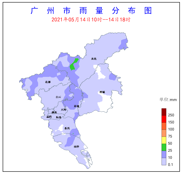 受低層偏南氣流影響,5月14日10時至14日18時從化區和番禺區出現小到中雨,局部出現了大雨,其余各區大部出現了小到中雨,局部有6-9級陣風和強雷電。全市共有4個測站(占比1.1%)雨量超過25毫米。番禺區石樓鎮錄得全市最大累積雨量33.3mm,同時該站錄得全市最大小時雨量23.6mm。另外,全市共有50個測站(占比13.81%)錄得6級以上陣風,黃埔區長洲街錄得全市最大陣風20.9m/s(9級)。