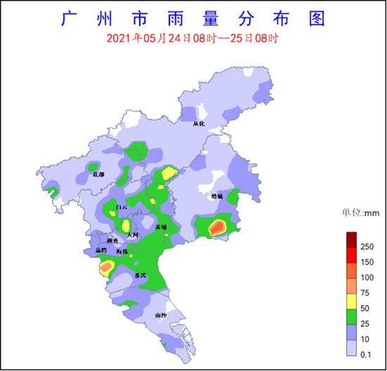 2021年5月24日8時至25日8時,我市出現中雷雨局部暴雨,局部伴有6~7級陣風和強雷電,全市共有327個測站(占比90.33%)出現降雨,全市平均雨量16.12毫米,2個測站(占比0.55%)雨量超過100毫米,14個測站(占比3.87%)雨量超過50毫米,82個測站(占比22.65%)雨量超過25毫米。增城區石灘鎮錄得全市最大雨量117.8毫米,其余各區最大雨量(單位:毫米):越秀區北京街30.1,天河區長興街78.6,荔灣區東沙街29.3,海珠區琶洲街51.7,白云區鐘落潭鎮57.4,黃埔區云埔街53.6,番禺區大石街105,南沙區欖核鎮34.3,花都區花東鎮42.5,從化太平鎮62.7。另外,23個測站(占比6.4%)出現6~7級陣風,其中黃埔區云埔街錄得全市最大陣風15.6m/s(7級)。