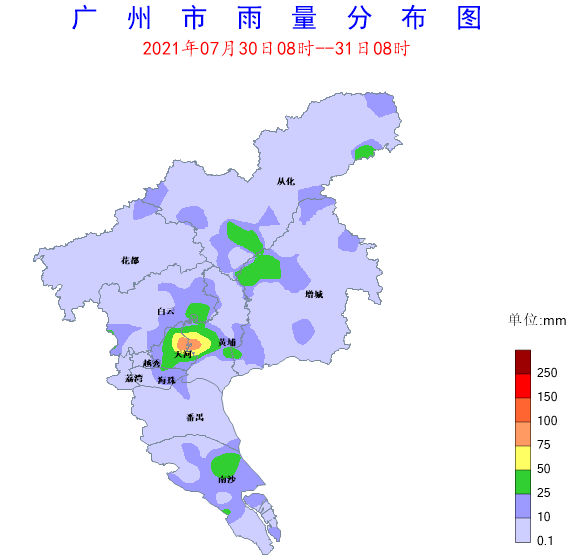 受西南氣流和弱切變的影響,2021年7月30日10時至16時,我市天河區、黃埔區、南沙區、白云區、增城區出現了中到強雷雨,其余地區有雷陣雨,全市共有266個測站(73.48%)出現降雨,全市平均雨量8.2毫米,1個測站(0.28%)雨量在100~250毫米之間,9個測站(2.49%)雨量在50~100毫米之間,22個測站(6.08%)雨量在25~50毫米之間。各區平均雨量(單位:毫米):越秀區0.1mm,天河區35.2mm,荔灣區0mm,海珠區8.2mm,白云區7.6mm,黃埔區16.4mm,番禺區2.3mm,南沙區12.1mm,花都區1.5mm,增城區5.2mm,從化區7.6mm。
