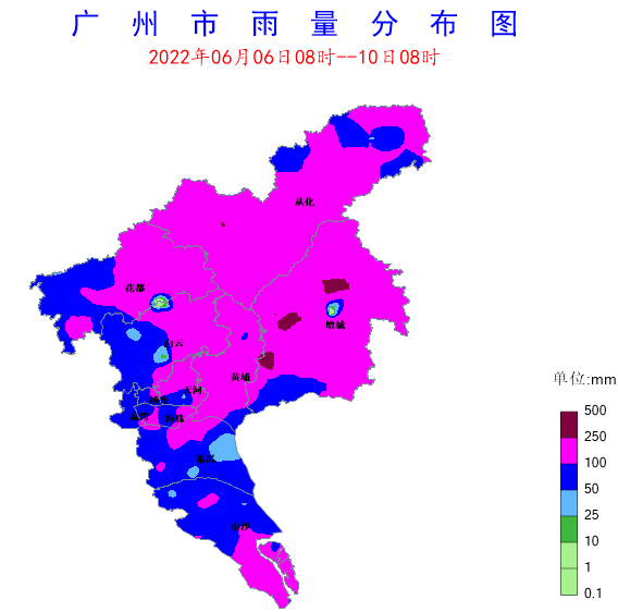 圖1 6日08時至10日08時廣州市雨量分布圖