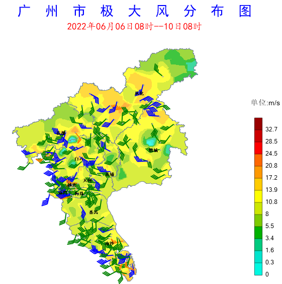圖2 6日08時至10日08時廣州市極大風分布圖
