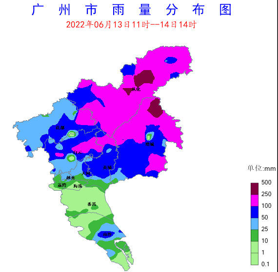 圖1 13日11時至14日14時廣州市雨量分布圖