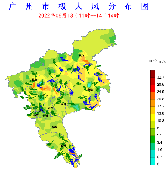 圖2 13日11時至14日14時廣州市極大風(fēng)分布圖