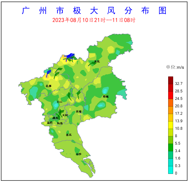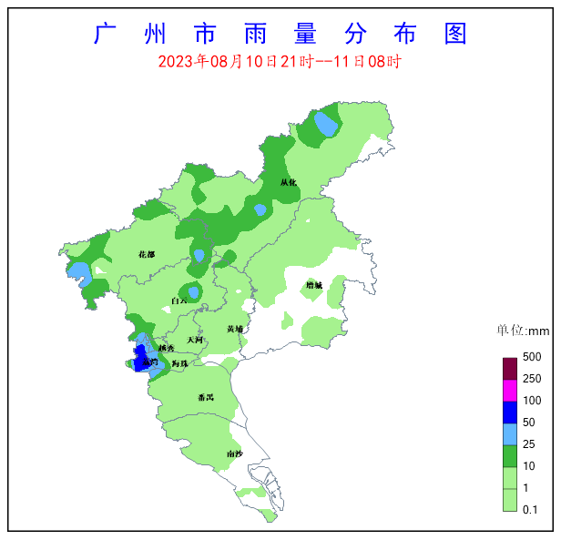 受低層西南急流和中層低渦影響,8月10日夜間至11日早晨我市出現了中到大雨局部暴雨,并伴有6-7級陣風和雷電,雨勢較強時段為10日23時至11日02時。392個站點(82.4%)出現降雨,全市平均雨量6.5毫米,14個站點(2.9%)雨量在50~100毫米之間,13個站點(2.7%)雨量在25~50毫米之間。各區平均雨量(單位:毫米):荔灣區60.2,海珠區20.5,花都區10,從化區9.1,越秀區8.1,白云區8,番禺區2.2,黃埔區1.2,天河區0.9,增城區0.6,南沙區0.5,其中荔灣區東漖街錄得全市最大累積雨量87.8毫米。全市共有:15個站點(3.2%)錄得6級以上陣風,15個站點(3.2%)錄得6~8級陣風,從化區鰲頭街錄得全市最大陣風16.9米/秒(7級)。