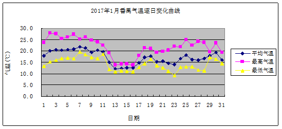 本月平均氣溫17.2℃,與累年平均值比偏高2.9℃。其中,上、中、下旬平均氣溫與累年平均值比分別偏高5.4℃、0.7℃、2.6℃,極端最高氣溫27.8℃,出現(xiàn)在2日,極端最低氣溫9.3℃,出現(xiàn)在23日。