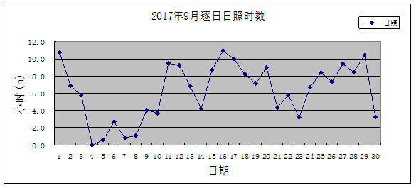 月日照時數187.3小時,與累年平均值比偏多1成。其中,上旬日照與累年比偏少近4成,中旬、下旬日照與累年比分別偏多4成多、近4成。