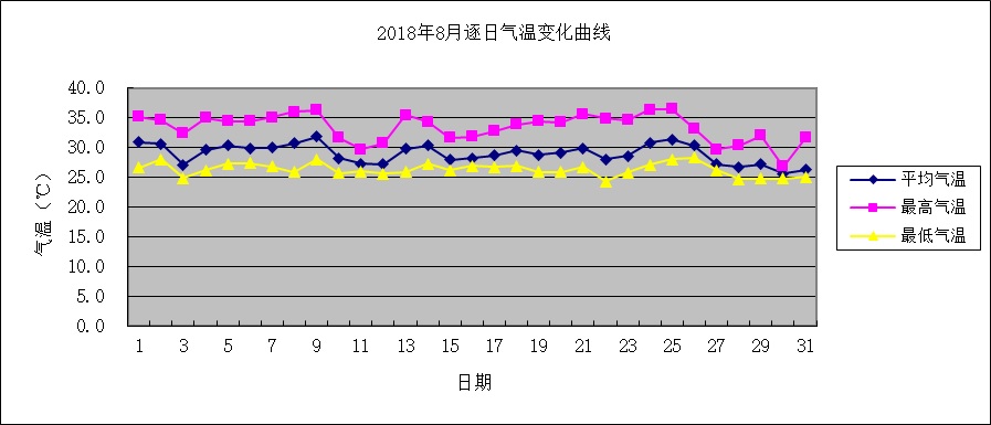 本月平均氣溫29.0℃,較常年偏高0.1℃。其中,上旬偏高0.8℃,中旬、下旬分別偏低0.1℃、0.3℃;極端最高氣溫36.5℃,出現在25日,極端最低氣溫24.3℃,出現在22日。