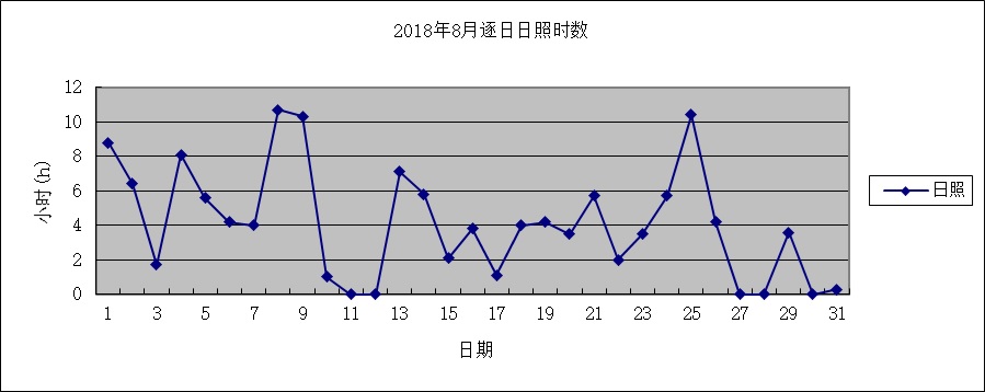 月日照總時數為127.8小時,與累年值比偏少3成。其中,上旬日照時數與累年值基本持平,中旬、下旬與累年平均值比分別偏少4成多、近5成。